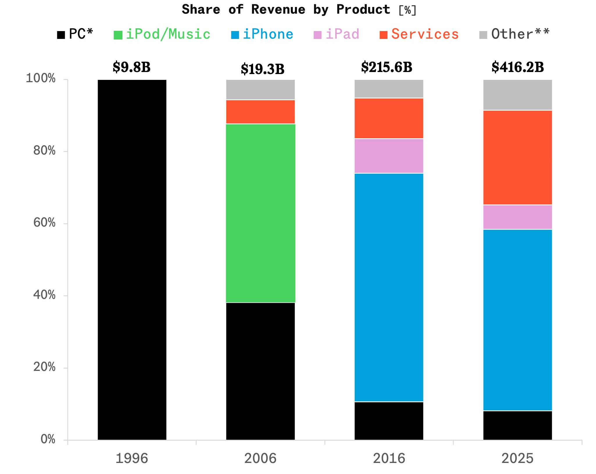 Apple started as a computer company in a garage and for the first 20 years that was basically the whole business. Then it almost died, came back with the iPod, and accidentally built a music empire. By 2006 the iPod and iTunes were doing $9.6 billion in sales, which was about half the company. Then the iPhone showed up, killed the iPod, and by 2016 it made up 63% of Apple's sales by itself.