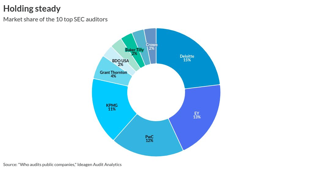 Everyone talks like the Big Four are losing their grip. Not really. In 2025 they still handled 51% of all SEC public company audits, basically flat from the year before. And if you zoom out to the 10 biggest audit firms, they control 65% of the whole market. Deloitte stayed on top with 926 SEC audit clients and 15% share. EY had 13%, PwC had 12%, and KPMG bumped up to 11%.